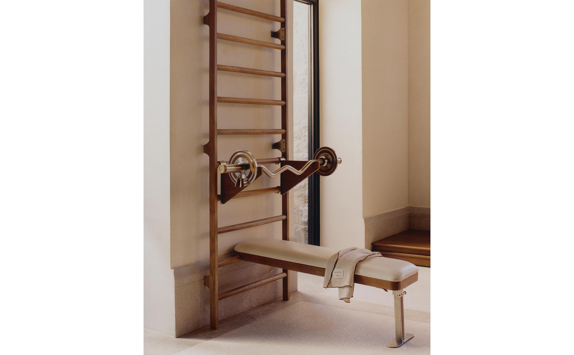 OAK WALL BAR WITH A STAND FOR BAR AND WEIGHTS.