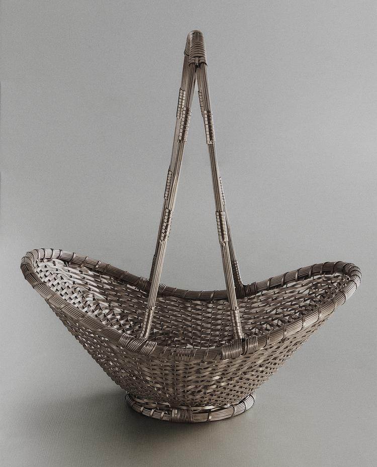 Basket made of woven brass. Long frame with thin handles. Slight variations in the weaving process.