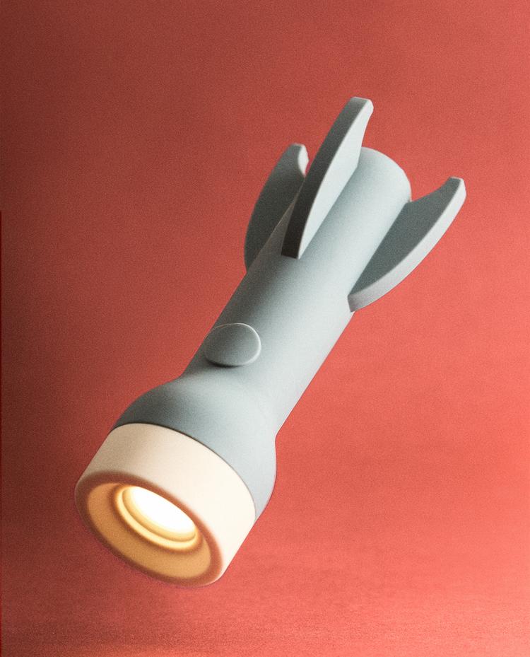 兒童手電筒,配備 LED 燈、可充電電池,外型為火箭造型。底部設有火箭尾翼,可調整不同擺放角度。