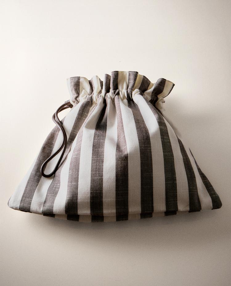 條紋布料製成的手袋。抽繩開合。