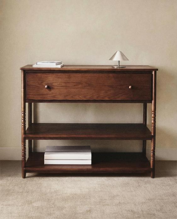 Ukrasni stolić od izrezbarenog jasenovog drva, s velikom ladicom i dvije police savršene za pohranu i ukrase.