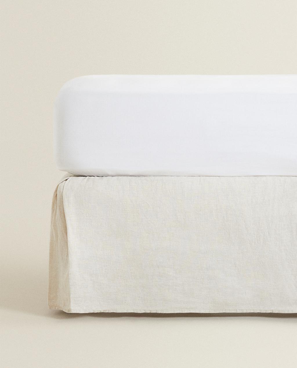 Our valence sheet, also known as bed base cover, is made of cotton and linen, featuring two openings at the corners and elastic edges to ensure it fits neatly around the mattress. The base of our valence sheet measures 200 cm long and the width varies depending on the size of the bed. The height of the frill is 35 cm.
