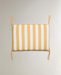 Slightly padded cotton bench back cushion with a striped design and matching trim detail. Cover the backrest on both the front and rear sides, and secures with ties at the lower corners. Designed as an outdoor cushion.