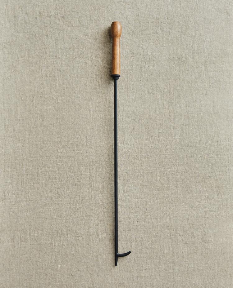 Iron poker with a wooden handle and elongated design, for moving and stoking the flames in the fireplace.