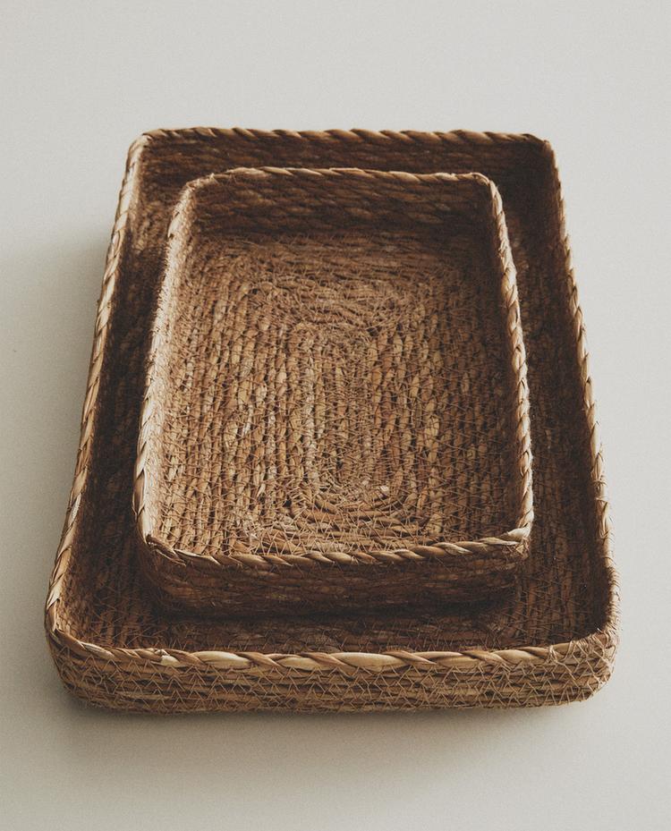 Rectangular seagrass tray basket with a woven finish. Its functional and natural design makes it suitable for organising and presenting small objects.