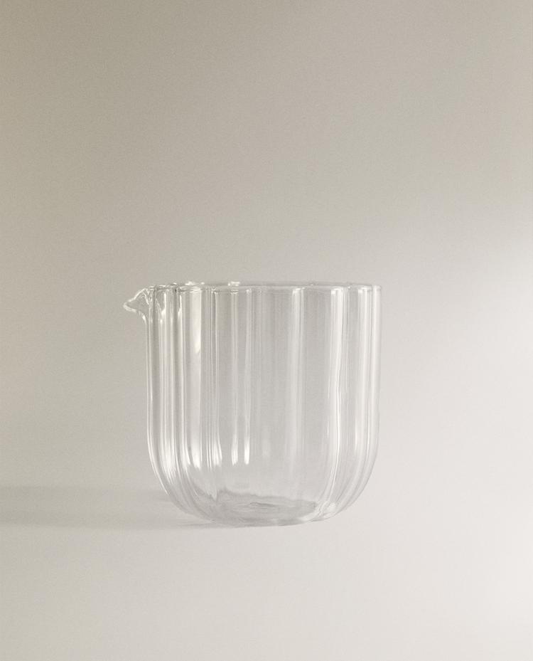 קנקן חלב שקוף מזכוכית בורו-סיליקט עם עיצוב מובלט.