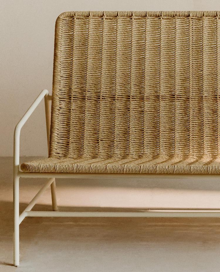 ספסל מתאים לשימוש בחוץ, עם מסגרת מתכת מלוקקת ומתאמי ידיים, וגב ומושב מקושרים.