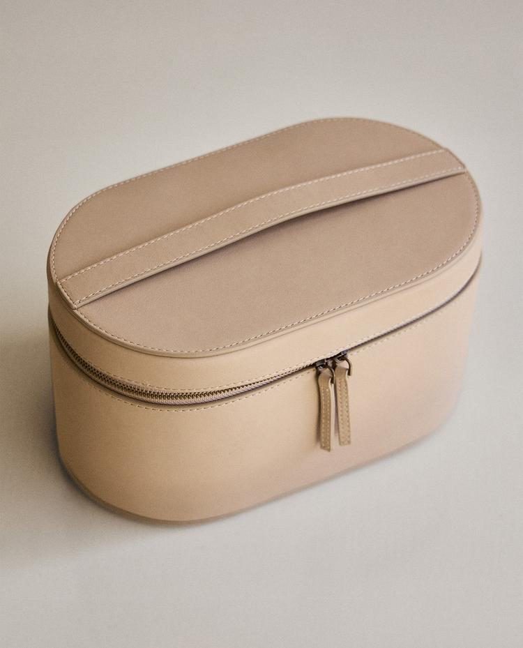 תיק רחצה קטן עם גימור עור. תאים פנימיים. סגירת רוכסן. ידית לנשיאה קלה.