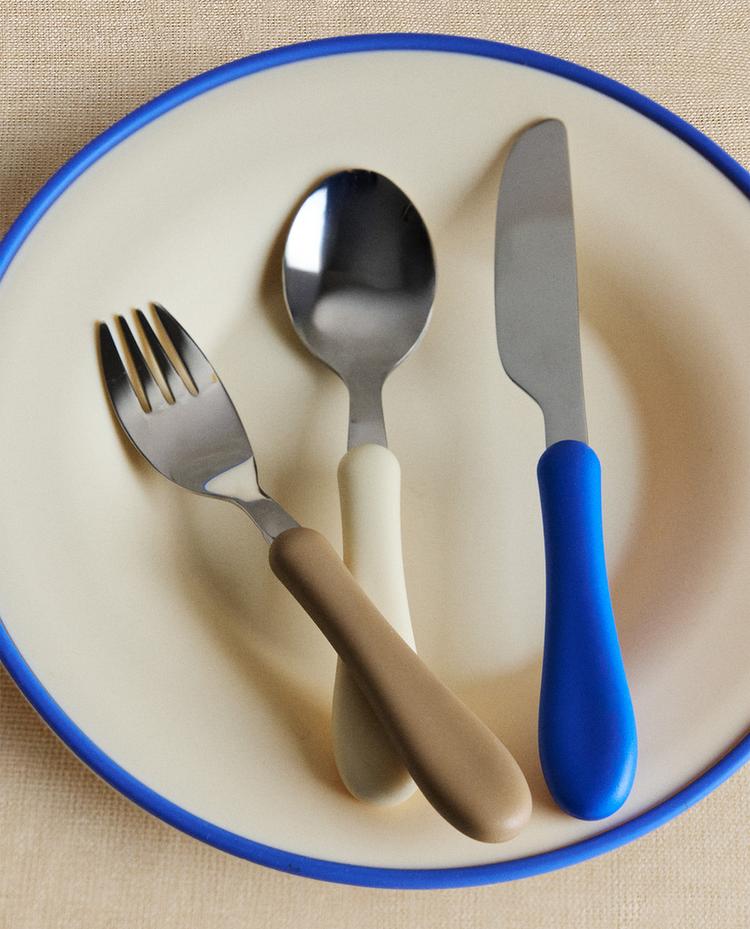طقم يحتوي على 3 قطع: سكين وملعقة وشوكة، ولكل منها مقبض بلون مختلف.