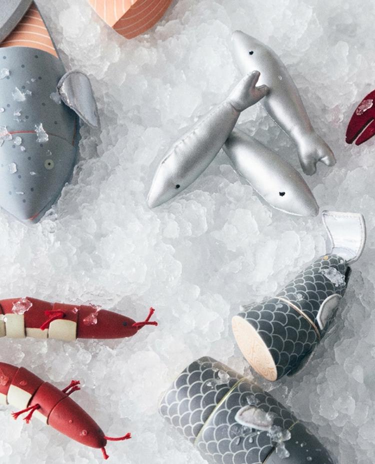 The set includes a 12-piece box featuring different types of fish, in wood and soft toy designs.