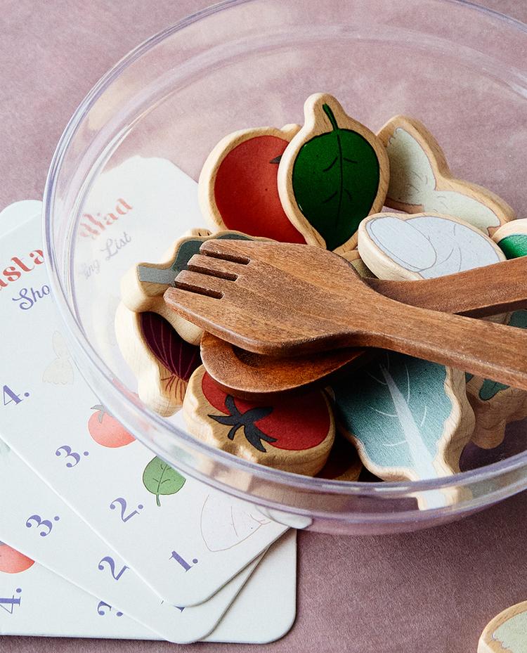 Includes 29 pieces: a wooden bowl, spoon and fork, three recipe cards and different pieces of wooden food (tomato, onion, carrot, cucumber, lettuce, pasta and cheese).