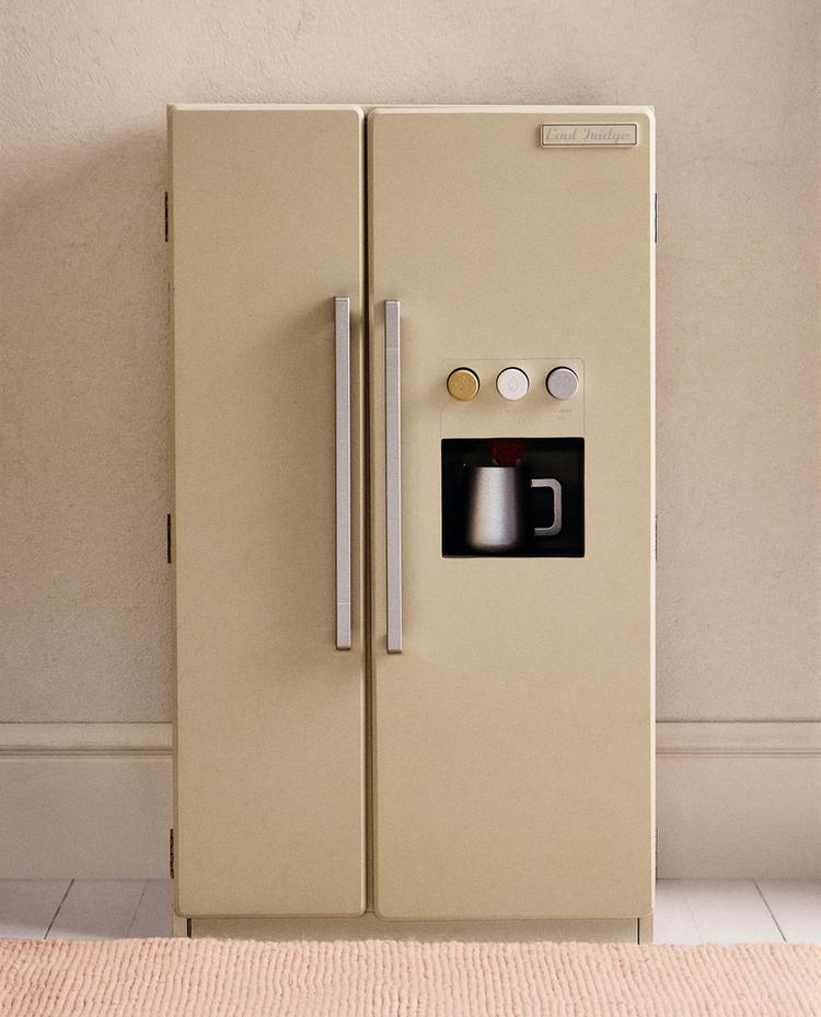 Kids’ wooden toy fridge with double door with integrated ice bucket and ice cubes included. Includes storage spaces and movable drawers.