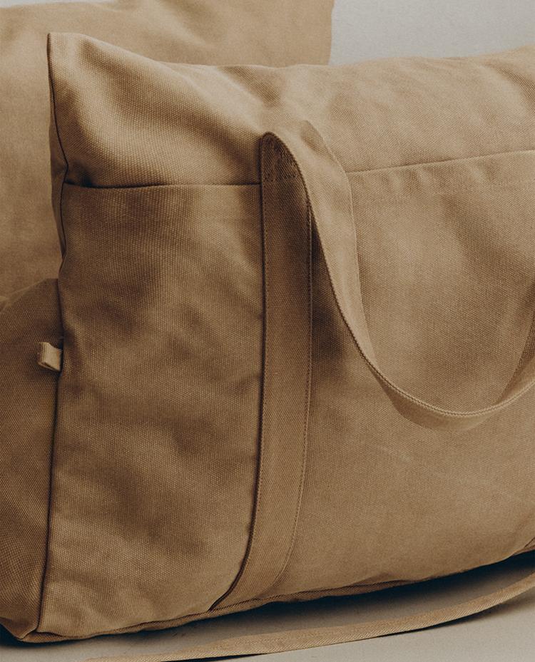 Portable padded bed for transporting pets in a car. Features short handles, side pockets and a longer adjustable and removable shoulder strap. Includes a cushion with a removable cover.