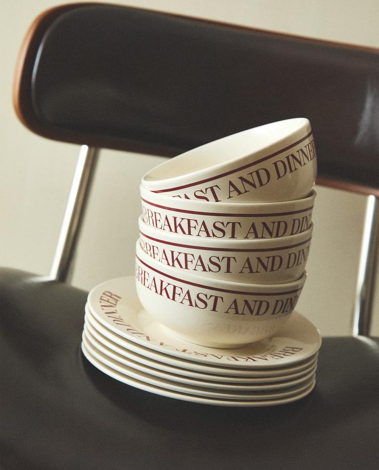 Porcelain bowl with the phrases "Breakfast and Dinner" and "Served all day 24 hours" in the same colour, and a decorative line around the edge.