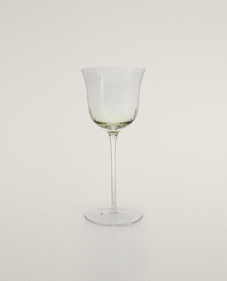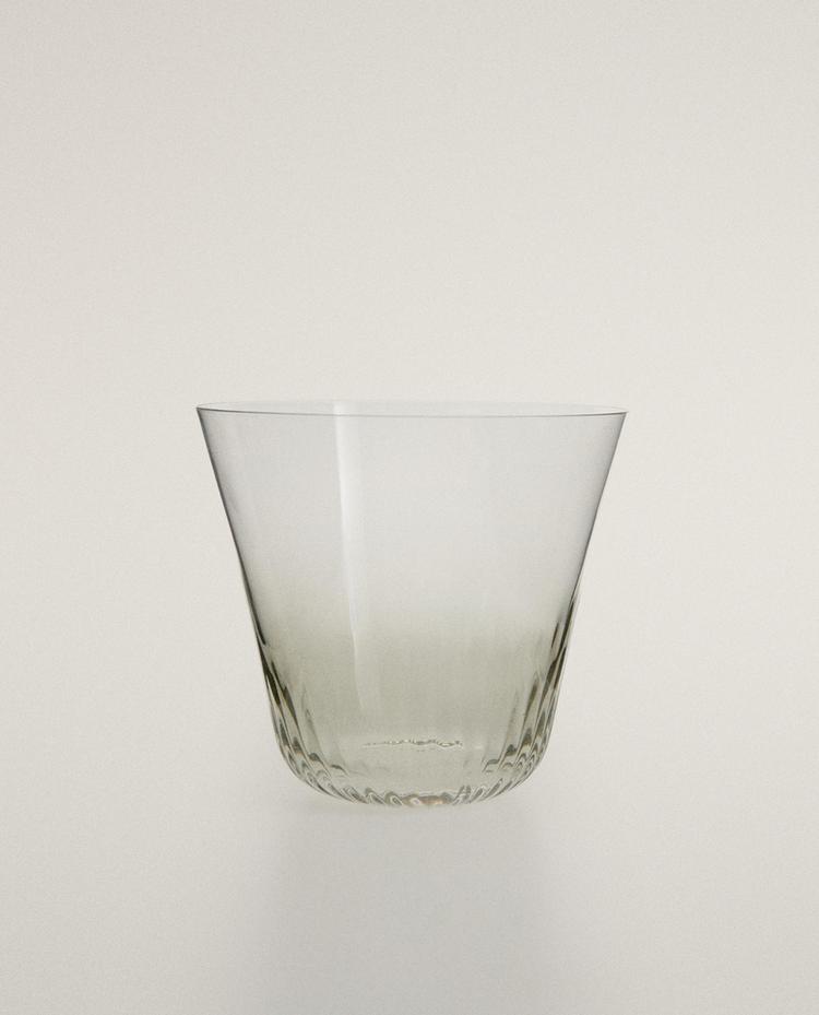 Tumbler made of transparent glass, featuring a smooth line design and balanced proportions. Featuring a slightly flared shape with a wider mouth and a solid, stable base. The glass features a subtle, irregular raised design at the bottom.
