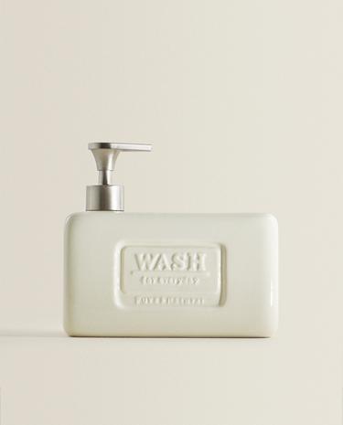 Dosatore per detersivo piatti in grès e acciaio inossidabile con vano contenitore per spugna o panno. Design moderno e molto pratico per tenere tutto in ordine.