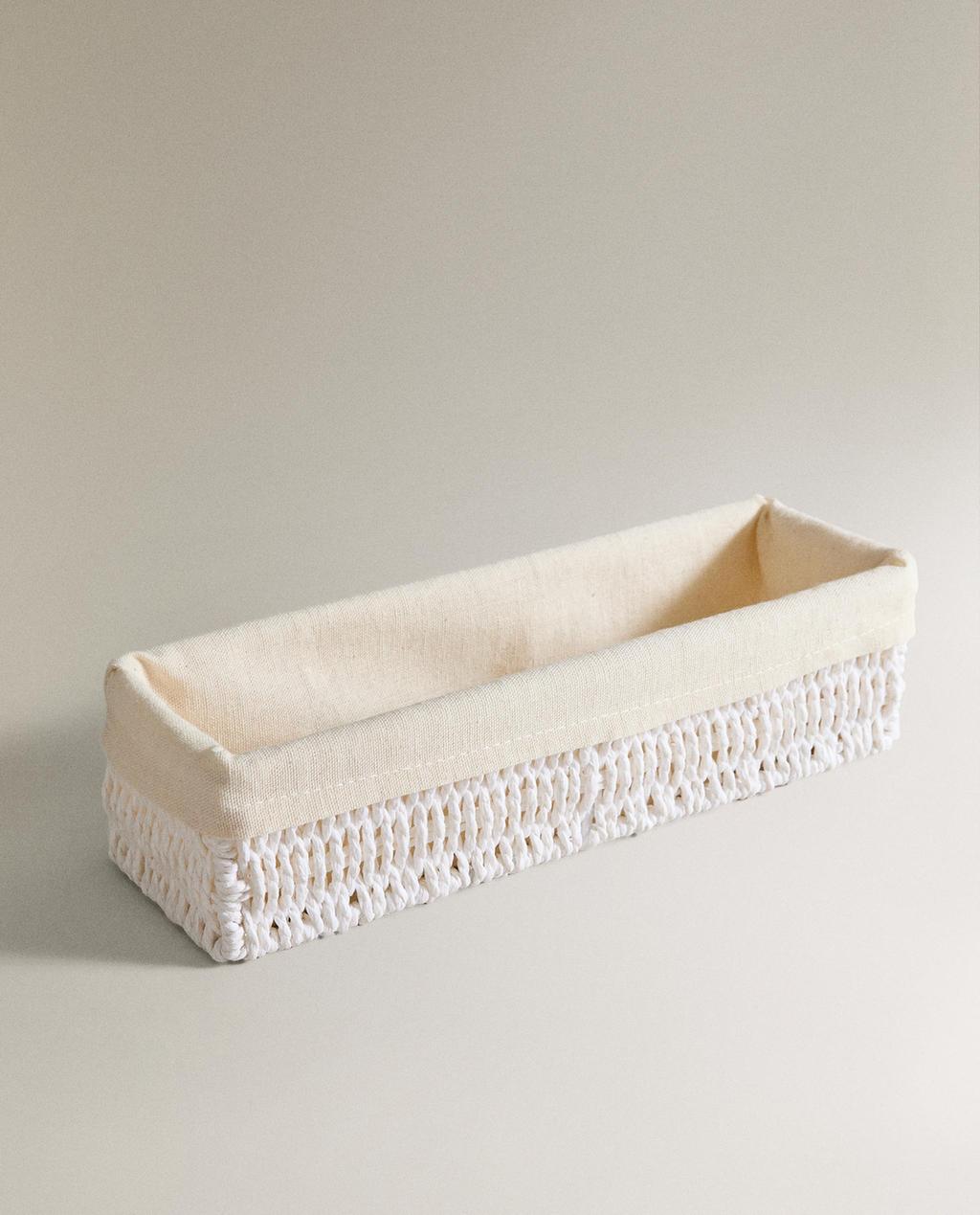 Cesta contenitore di forma rettangolare allungata, con struttura metallica rivestita in carta resistente con design intrecciato.