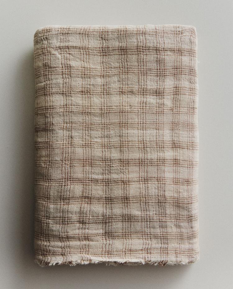 Coperta realizzata in lino, con motivo a quadri e rifinita con frange.