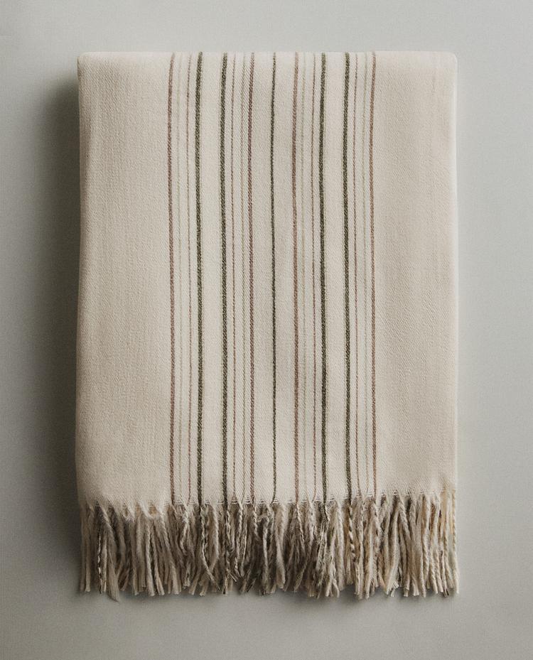 Coperta calda e leggera al tatto, realizzata in tessuto a tinta unita e design a righe.