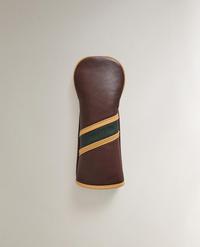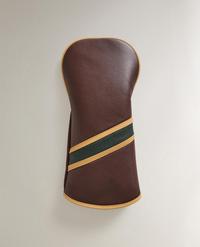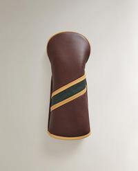 Custodia per mazza da golf tipo driver realizzata principalmente in pelle ovina. Design imbottito con regolazione elastica, che facilita la presa della mazza. Dettaglio di bande diagonali a contrasto di colore e finiture combinate.