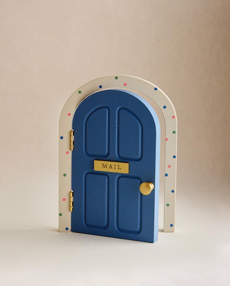 Mini porta per bambini in legno con forma ad arco e dettaglio con la scritta 'MAIL', ideata per essere posizionata sulla parete della cameretta dei bambini. Si può aprire e chiudere.