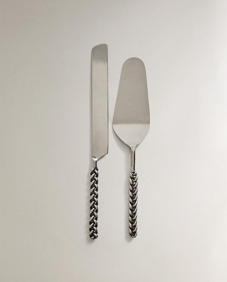 Posate realizzate in acciaio inossidabile con finitura lucida, composte da una scarpa bassa da torta e un coltello con superfici lisce e bordi definiti, abbinati a manici metallici decorati con un intreccio lineare in rilievo.