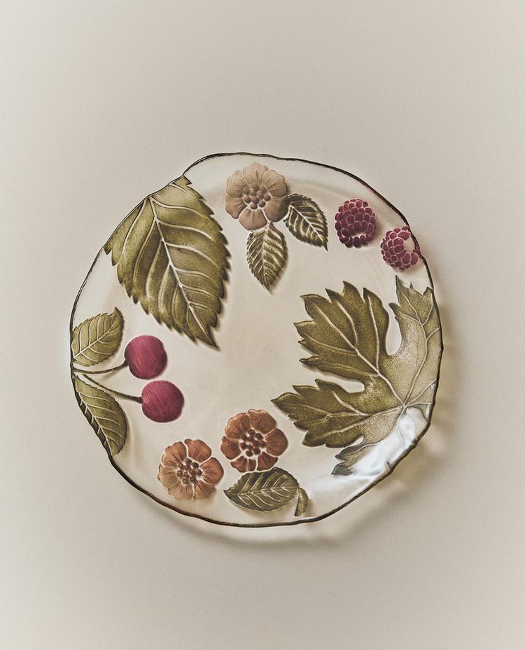 طبق للتحلية زجاجي بتصميم أزهار.