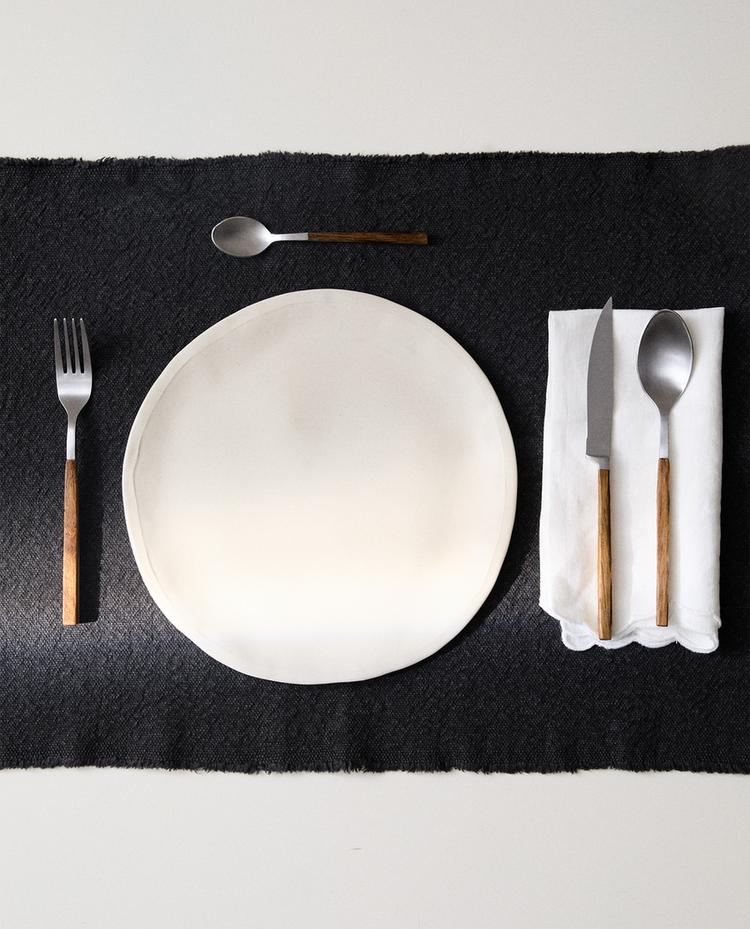 أدوات تناول الطعام من الستيل المقاوم للصدأ بمظهر ساتاني تتكون من شوكة وسكين وملعقة حساء وملعقة للتحلية. مقبض من الخشب الطبيعي الطبيعي المستقيم مع سطح أملس، مثبت بمسامير معدنية مرئية تضيف قوة وتباين مع الستيل. الطقم يتكون من 4 قطع.