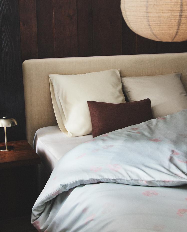 Duvet cover and pillowcase set in 300 thread count cotton sateen with a floral design.