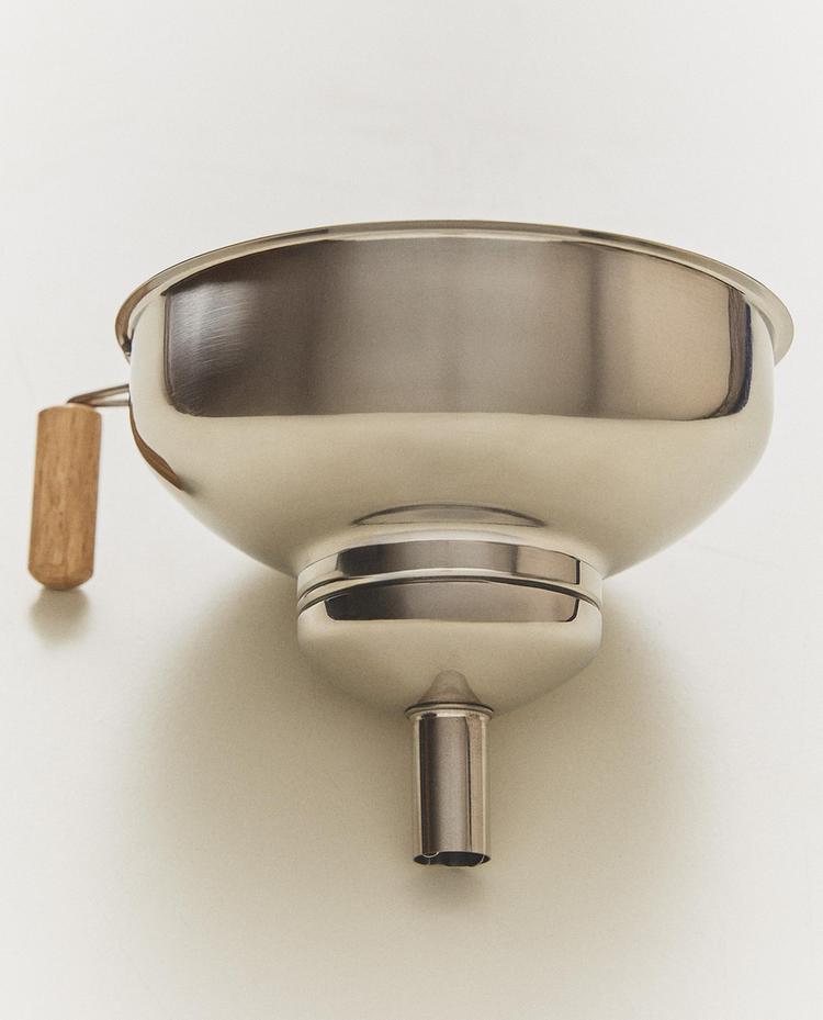 Stainless steel funnel with a spout for precise pouring. Removable colander piece and an oak wood handle for a safe grip, allowing easy and controlled pouring.