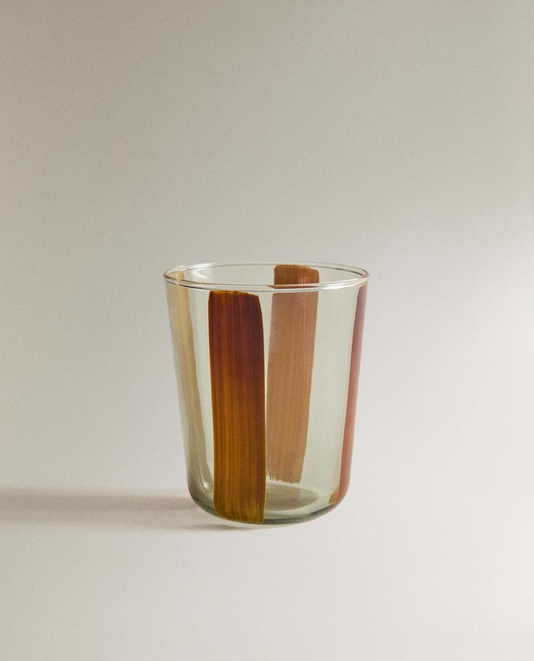 STRIPED GLASS TUMBLER 4.50 JODBROWN|0282/401/700Glass tumbler with a painted print design comprising irregular vertical stripes that add depth and craftsmanship.Capacity: 315 mlHeightWidthDepth9 cm8 cm8 cm4.50 JODEnter quantity of units to purchase Quantity updated to 1 units Measurement guideAdd 4.50 JOD
