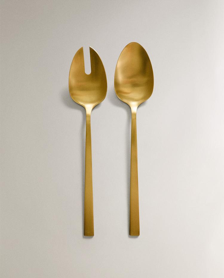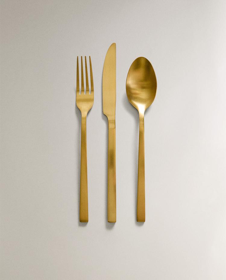 골드 스테인리스 스틸 소재의 무광택 마감 처리된 포크, 나이프, 스푼으로 구성된 커트러리.