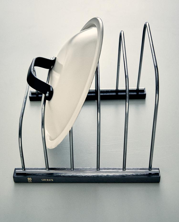 냄비 뚜껑이나 도마를 6개까지 거치할 수 있는 금속 정리대. 목재 받침대가 있으며, 조리대 위나 서랍 안에 둘 수 있도록 디자인되었습니다.