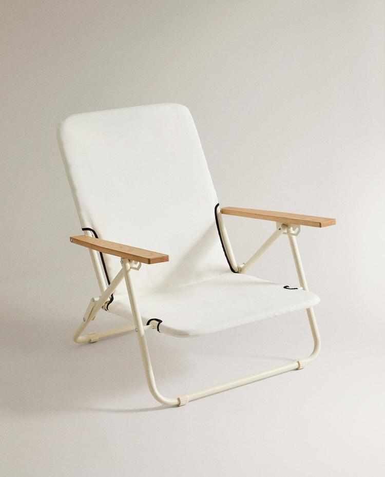 메탈 프레임과 뒤로 젖힐 수 있는 좌석, 물푸레 나무 소재 팔걸이, 대비색 파이핑이 매치된 단색 패브릭으로 구성된 접이식 비치 체어. 등받이 기울기를 4단게로 조절할 수 있습니다.
