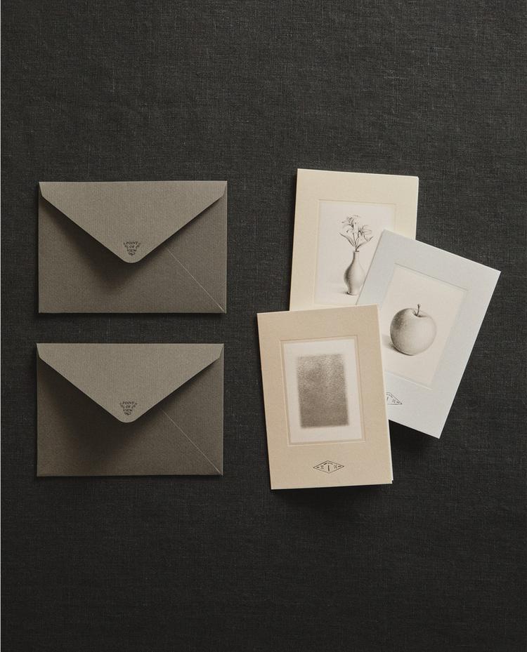 로고가 새겨진 단단한 상자에 검정 봉투 6개, 포스트 카드 6장(2장씩 3가지 디자인)이 들어 있습니다.