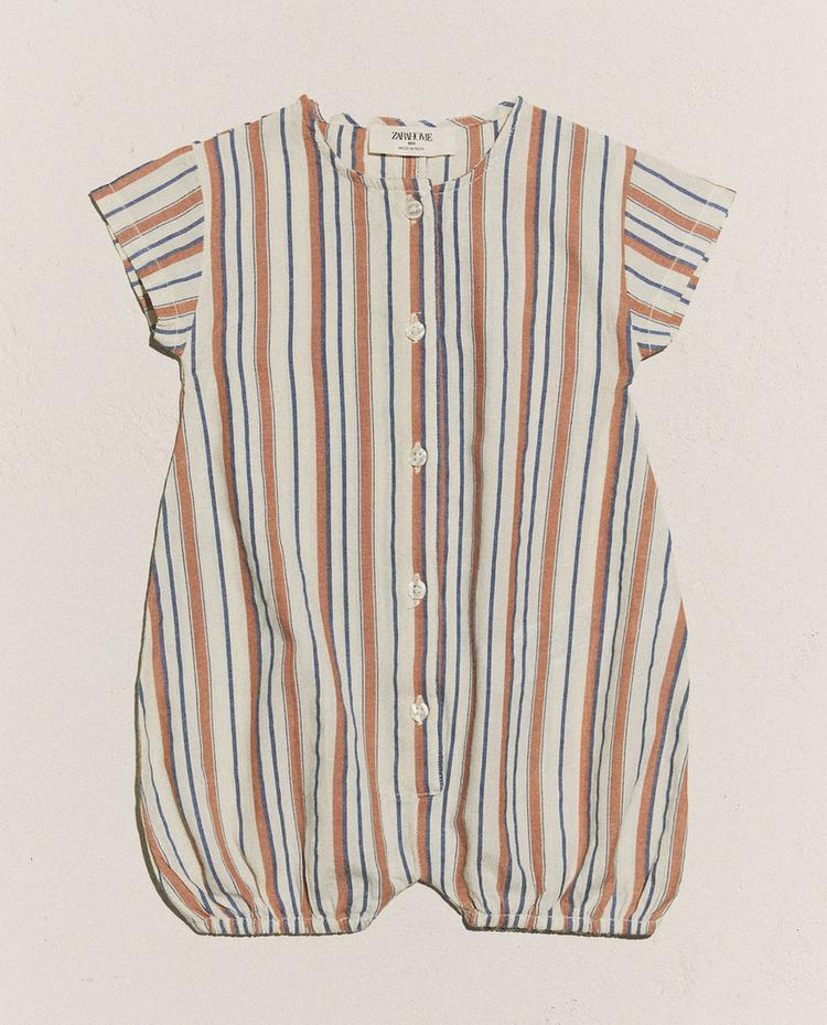 أفرول قطني للرضّع بتصميم مخطط. بدون أكمام مع أساور مرنة وطرف سفلي.