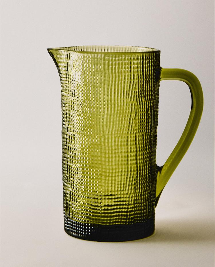 إبريق من الزجاج الشفاف بملمس منقوش على شكل خطوط متقاطعة، تمنحه الشكل الشبكي أو القماش الرقيق. يتميز بتصميم أسطواني طويل وفوهة ناعمة للسكب ومقبض متين مصنوع من نفس الخامة.