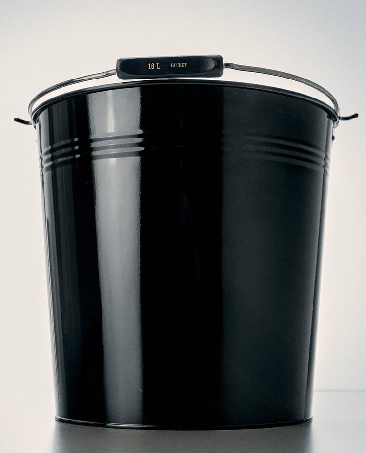 دلو معدني بمقابض جانبية وتفصيل خشبي لحمله بسهولة.
