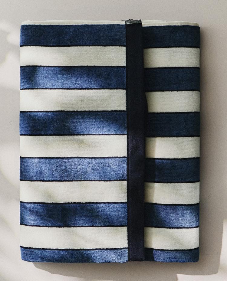 منشفة شاطئ من القطن الفيلور الناعم بتصميم مخطط عمودي وحافة علوية بلون متباين.