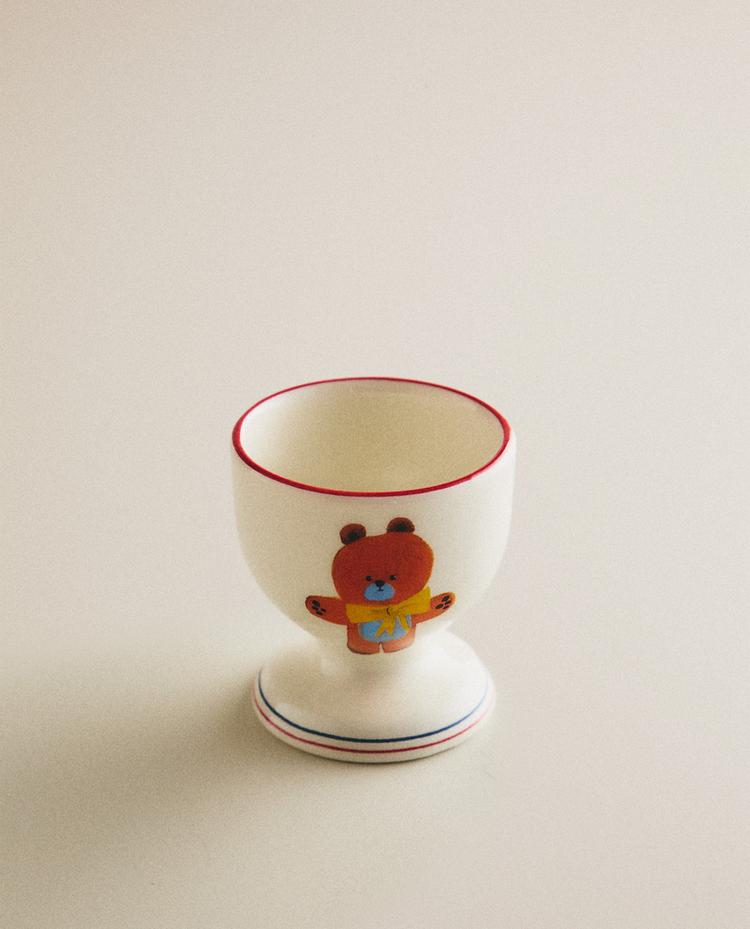 Porcelain egg cup with a contrast-coloured edge, decorated with bear with bow tie x The Animals Observatory motifs.