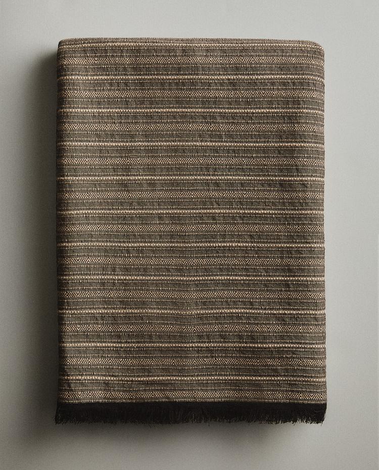 Blanket made of linen and cotton with a brown stripe design and fringed edges. It offers warmth, softness and lightness, ideal as a decorative throw for the couch or for placing at the foot of the bed.