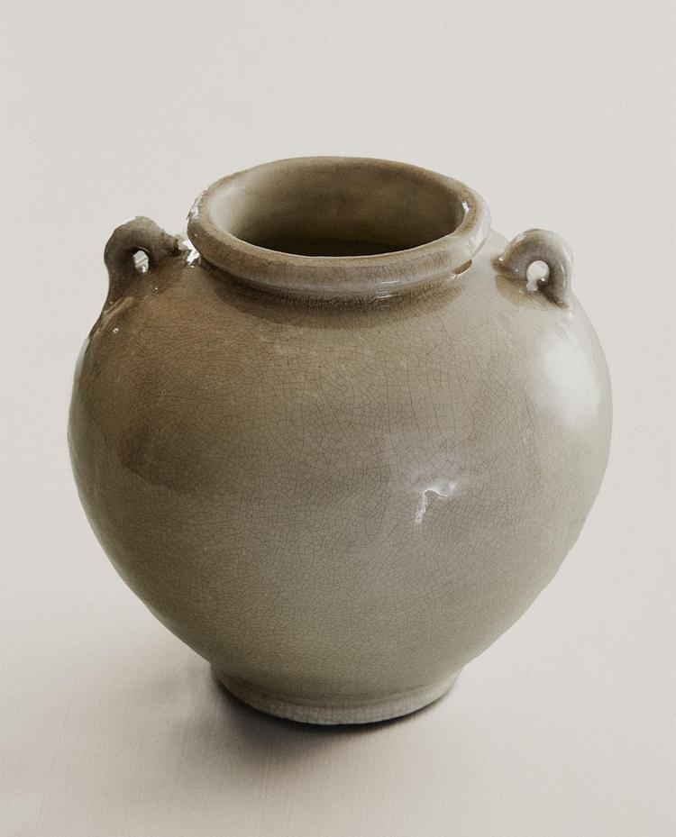 Ceramic vase with a round body, a wide mouth, small decorative side handles and an enamelled and cracked finish.