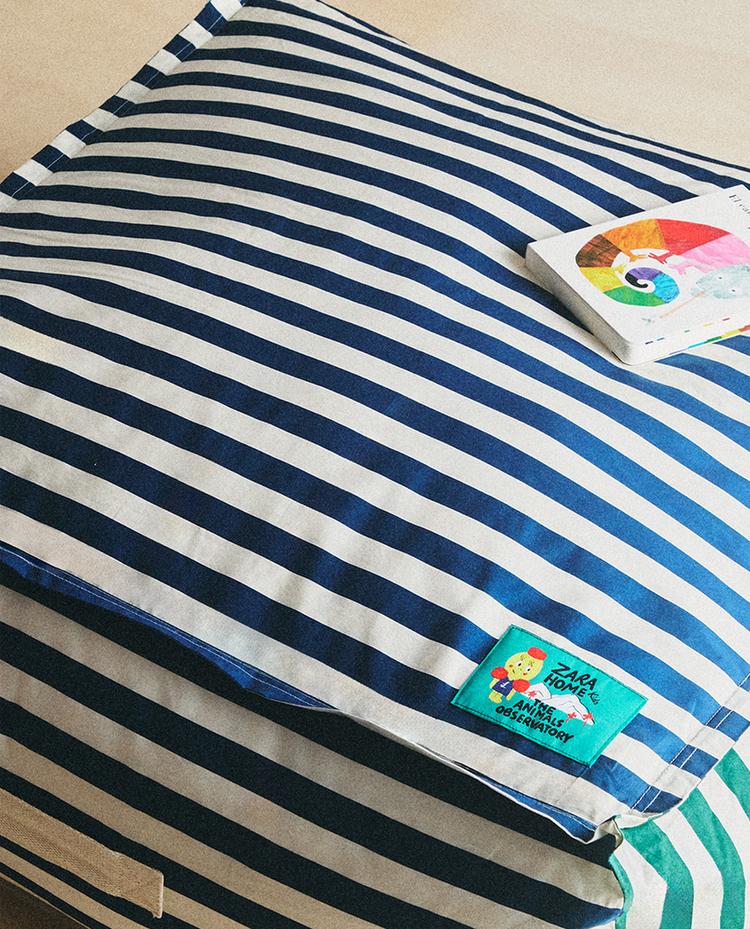 Kids’ x The Animals Observatory pouffe made of 300 thread count cotton percale with a striped design and a side handle for easy carrying.