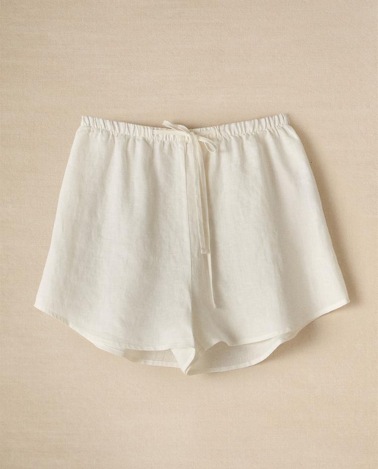 Linen shorts in a plain design with an elasticated waistband and adjustable drawstrings at the front.