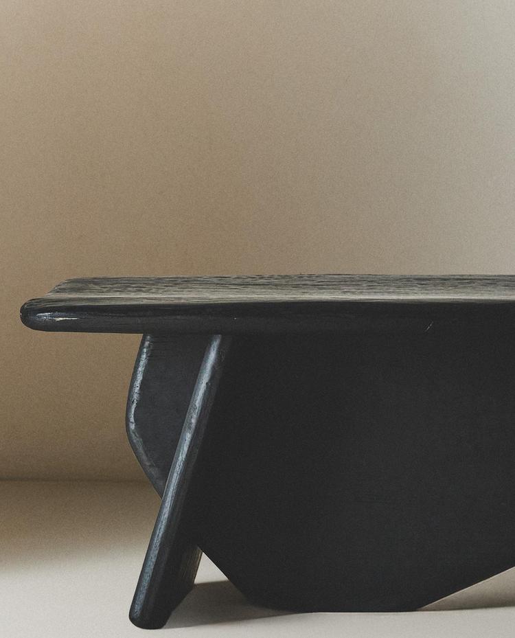 Irregular-shaped bench made of dark-coloured wood. The wood features a visible texture.