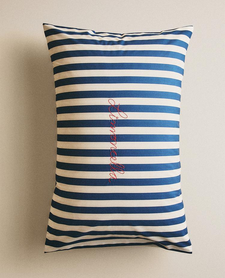 Kids' pillowcase in 300 thread count cotton with a striped design and "Limoncella" embroidery.