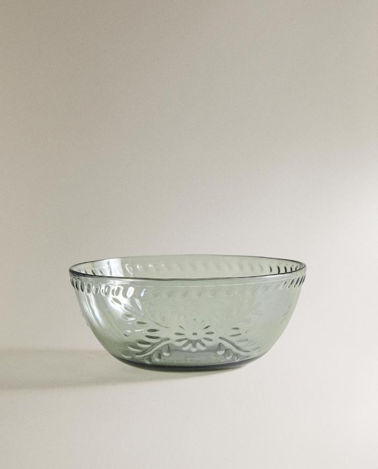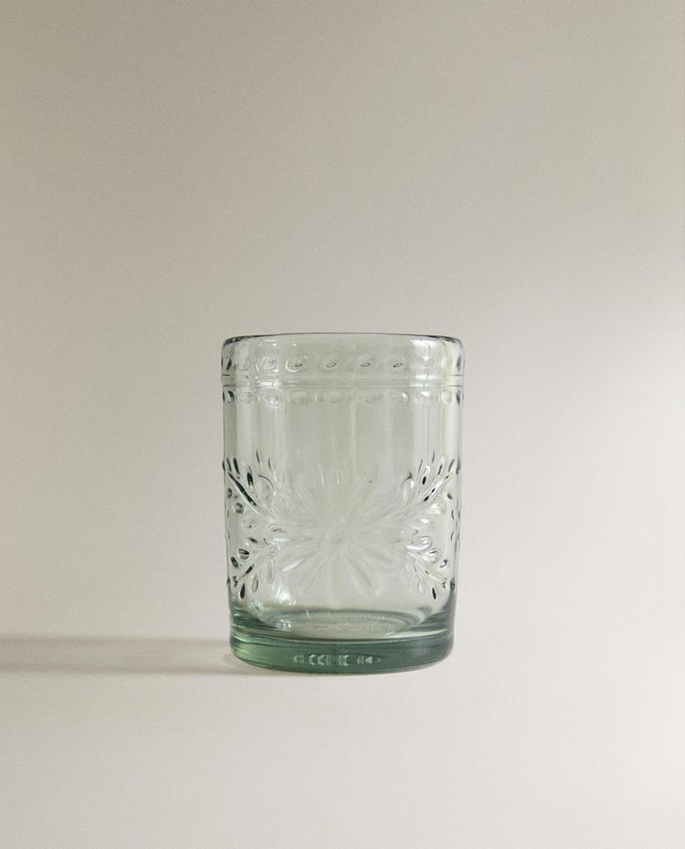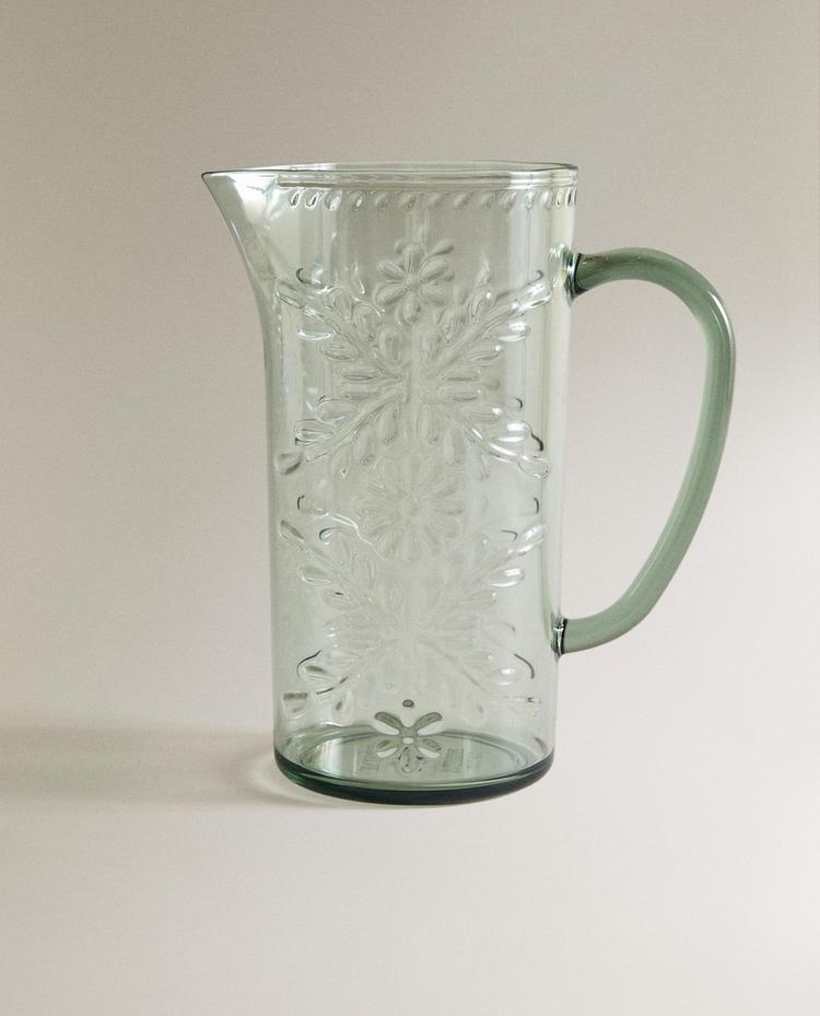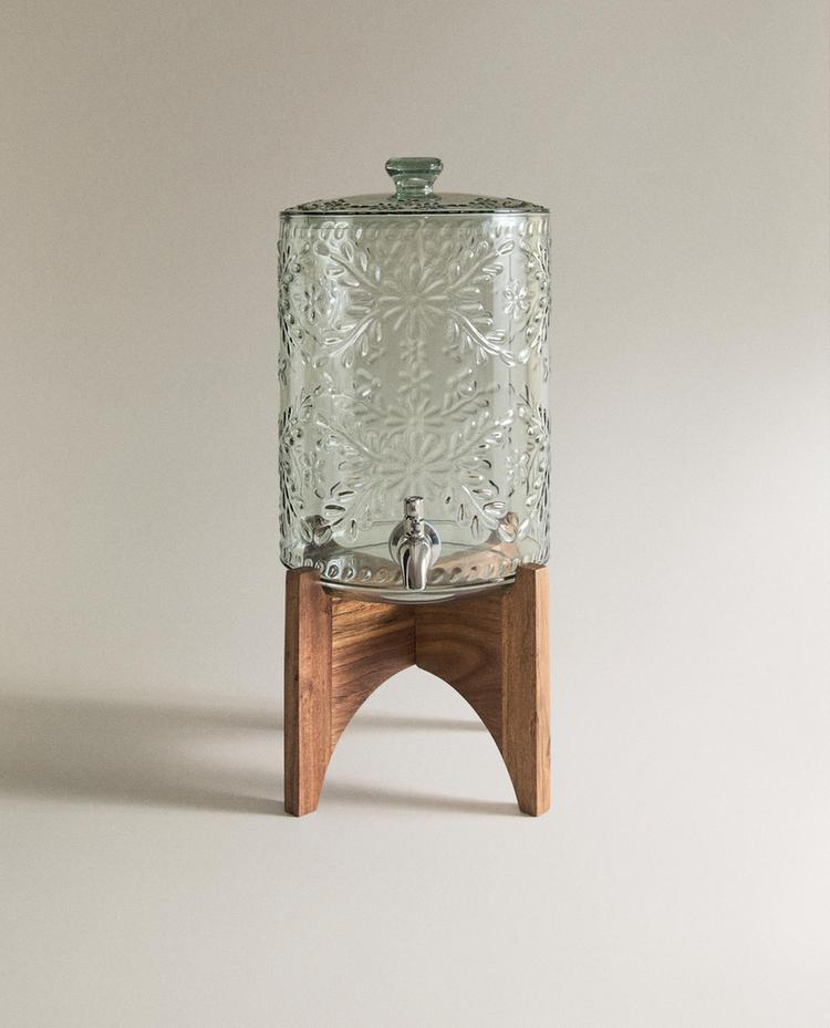 Диспенсер для напитков с основанием из древесины акации, краном из нержавеющей стали и емкостью с рельефным цветочным узором. Объем 6,5 л.