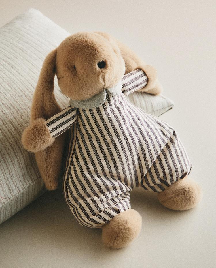 Детская мягкая игрушка в форме кролика, одетого в полосатый комбинезон. Сзади есть веревка, при натягивании которой звучит нежная мелодия.