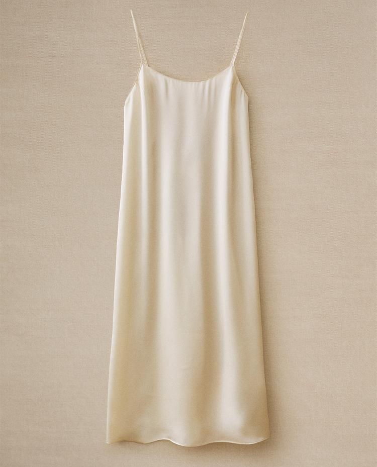 Длинная комбинация из однотонного шелка с тонкими бретельками и вырезом на спине.