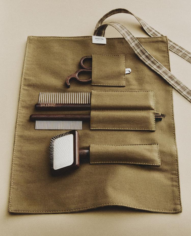 Комплект для ухода за домашними животными, состоящий из четырех принадлежностей из дерева и нержавеющей стали: щетки, двух расчесок и кусачек для когтей. Включает хлопковый чехол с внутренними отделениями и клетчатой лентой для застегивания.